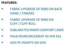 | Fingers/Backhand | PE foams and PE inserts for lightweight construction and elite level protection using D3O® impact and shock absorption technology (9080). Added PE inserts on side wart |