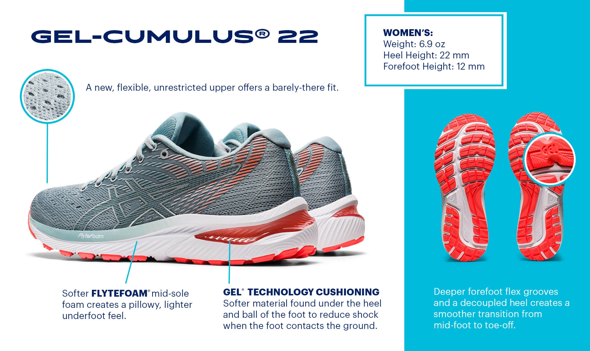 The GEL-CUMULUS® 22 running shoe is a recommended choice for neutral runners who want a soft and flexible everyday trainer with a great fit. This update features a one-piece mesh upper that’s combined with a seamless 3D print construction to improve support and comfort around the foot. The FLYTEFOAM® technology in the midsole is softer than the previous version to promote a pillowy ride. Under the heel where the foot first hits the ground has been redesigned to isolate impact while the new heel design’s deeper forefoot flex grooves and softer midsole foam create a smoother ride. Lastly, a hard-wearing AHAR® rubber outsole compound has been placed in key contact areas to help the GEL-CUMULUS® 22 shoe stand up to a ton of miles.