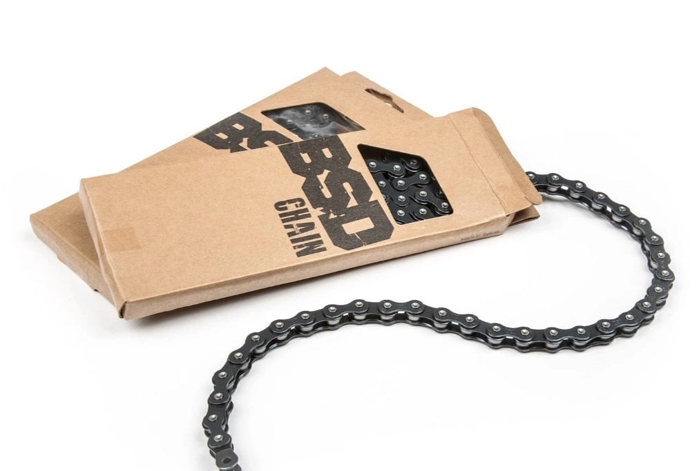 A super tough chain with pre-installed half link, rustproof and teflon coating, stamped BSD logos and mushroomed pins. Compatible with 8t drivers.